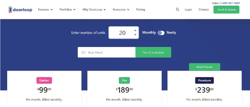DoorLoop’s pricing starts at $79 per month for up to 20 units for their starter plan. It’s important to note what’s not included on this entry-level plan, like access to phone support for customer service help or accounting reports. Costs increase based on portfolio size, and most advanced features require upgrading to higher tiers.